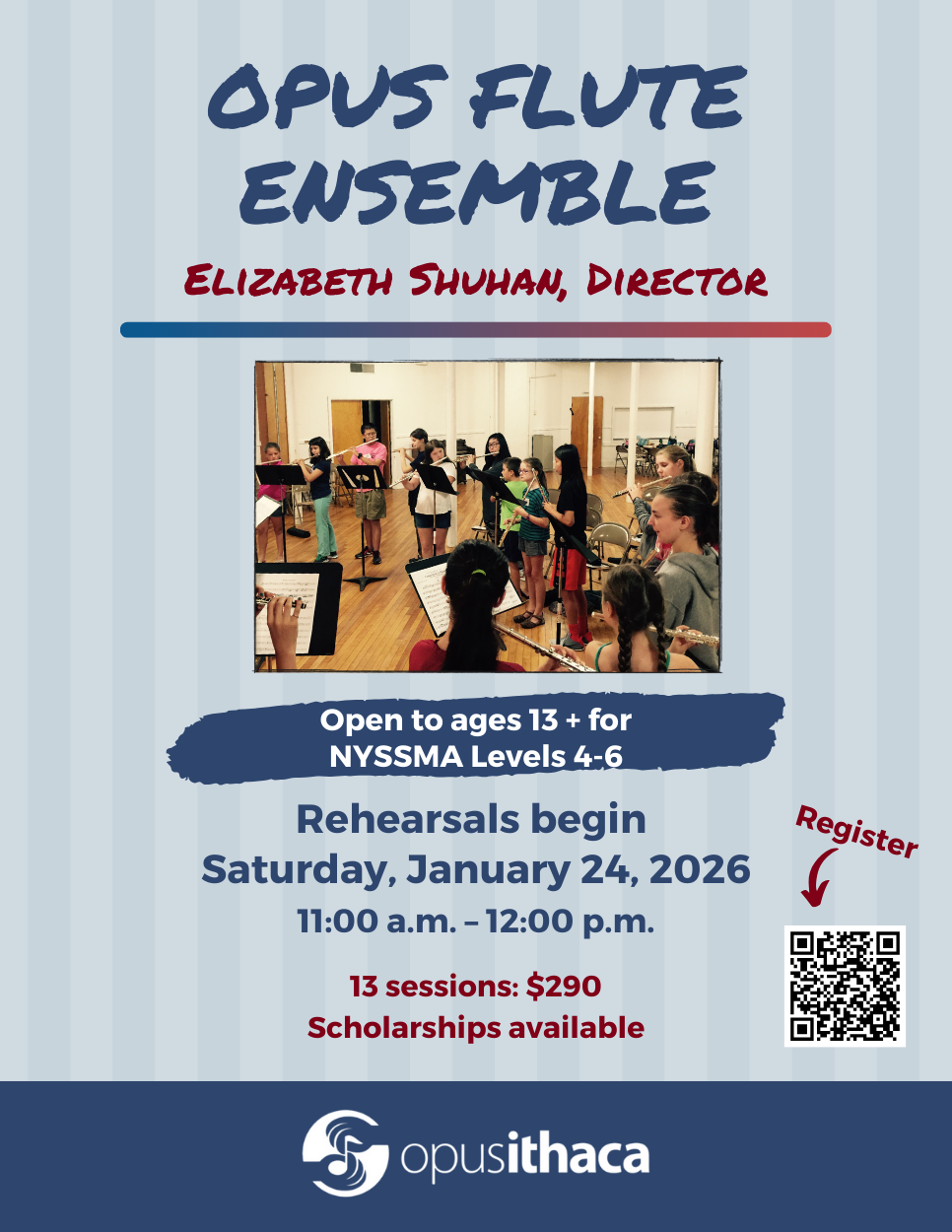 Opus Flute Ensemble is a select group of students ages 13+ (NYSSMA levels 4-6) committed to learning chamber music for multiple flutes, including piccolo, alto and bass flutes. Under the direction of Elizabeth Shuhan, an environment is fostered where the development of performance, ensemble, and leadership skills are shared. The small size of the ensemble facilitates individual attention for each student, resulting in increased musical growth and enhanced student potential.