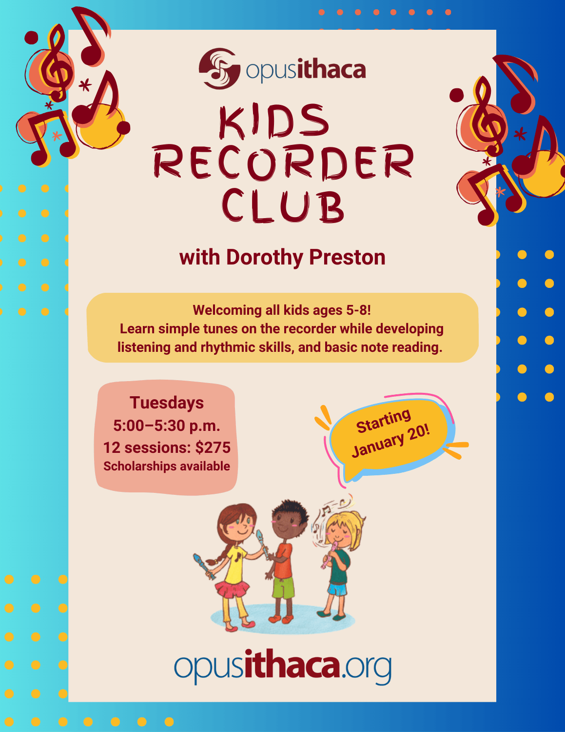 Welcoming all kids ages 5-8! Learn simple tunes on the recorder while developing listening and rhythmic skills, and basic note reading.