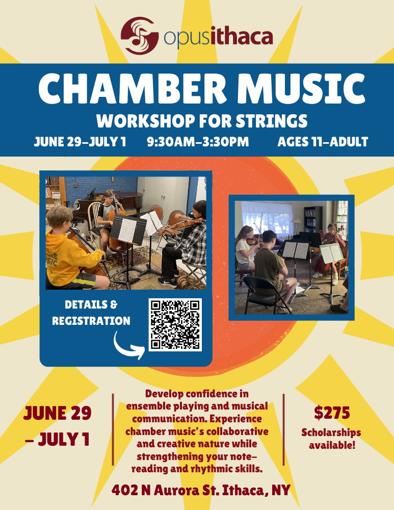 Opus Ithaca is pleased to offer a 3 day strings chamber music workshop for intermediate to advanced string players, ages 11-adult. Violin, viola, cello and bass players welcome!